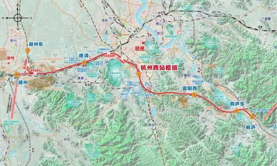 湖杭鐵路是杭州西站南北向引入的高鐵線路。項目由新成立的湖杭鐵路有限公司負責建設,委托鐵路上海局集團公司指定的滬昆客運專線浙江公司負責代建,建成后也將委托鐵路上海局集團運營管理。北段湖州至杭州西是商合杭鐵路的組成部分,南段杭州西至桐廬既是杭黃鐵路連接線,又是杭溫鐵路的組成部分。線路從既有寧杭高鐵湖州站引出,經湖州市南太湖新區、吳興區、德清縣,杭州市余杭區、西湖區、富陽區和桐廬縣,跨富春江新設桐廬東站后引入杭黃高鐵桐廬站,新建線路長約136公里(含杭臨績鐵路等同步實施工程),設計時速350公里。全線設車站6座,其中利用既有站2座(湖州站、桐廬站),改建既有車站1座(德清站)、新建車站3座(杭州西站、富陽西站、桐廬東站)。本項目還包括在擬建滬蘇湖鐵路預留位置新建的湖州東站。