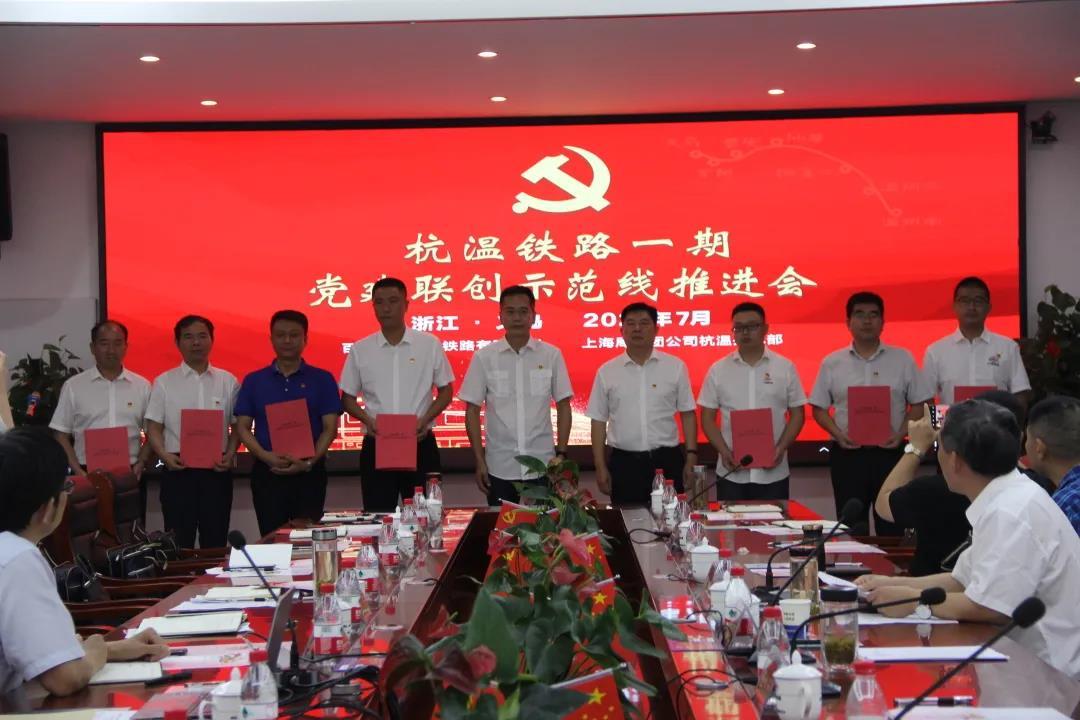 為切實發揮黨組織的示范引領和黨員的先鋒模范作用,進一步強化對黨建聯創示范線創建工作的考核管理,壓實工作責任,明確工作目標,杭溫鐵路各參建單位負責人向杭溫公司、杭溫工程建設指揮部遞交了《杭溫鐵路一期黨建聯創示范線目標責任書》,并由杭溫公司和杭溫工程建設指揮部共同為各參建單位授予了“黨建聯創先鋒隊”旗幟,杭溫鐵路各參建單位在會上也作了表態發言,表明了對于創建黨建聯創示范線以及進一步加快推進杭溫鐵路項目建設的信心和決心。