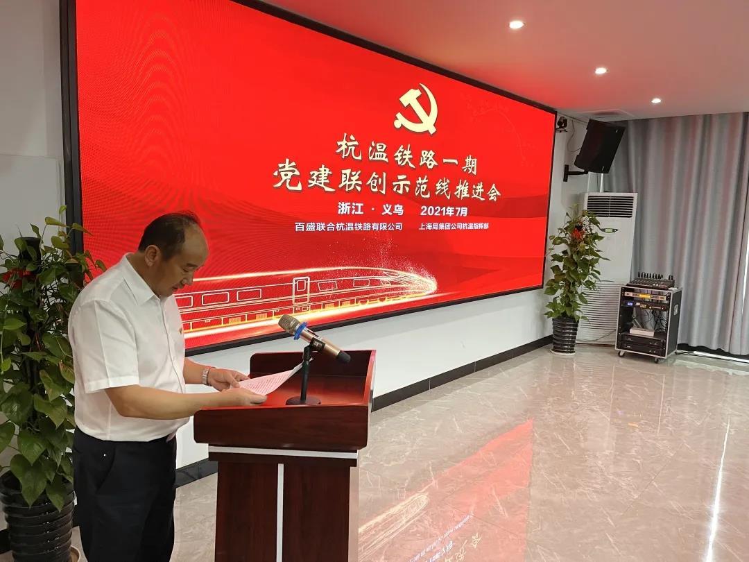 為喜迎建黨100周年,切實發揮杭溫鐵路各參建單位黨組織的戰斗堡壘作用和黨員的先鋒模范帶動作用,更好地統一思想、凝聚共識、形成合力,全面助推杭溫鐵路項目建設,全力打造黨建聯創示范線,7月1日,百盛聯合杭溫鐵路有限公司與杭溫工程建設指揮部在中鐵十一局杭溫鐵路站前1標項目部聯合組織召開了杭溫鐵路一期黨建聯創示范線推進會。杭溫公司、杭溫工程建設指揮部、鐵四院、杭溫鐵路沿線各地鐵辦、杭溫鐵路各參建單位相關負責人參加會議,會議由杭溫工程建設指揮部副指揮陳云峰主持。
