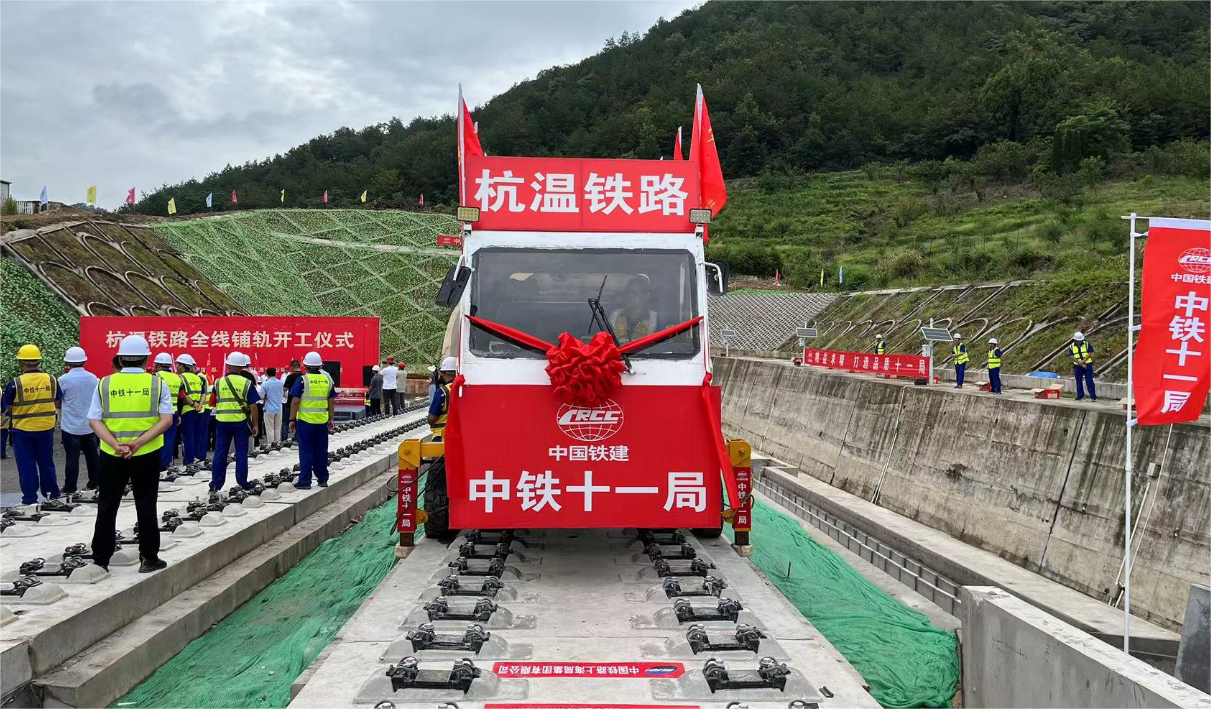 7月20日10時,在杭溫鐵路香山嶺隧道出口施工現場,隨著一對500米長鋼軌平穩地鋪設在無砟軌道板上,國內首條“雙示范”民營控股高鐵——杭溫鐵路開始全線鋪軌。