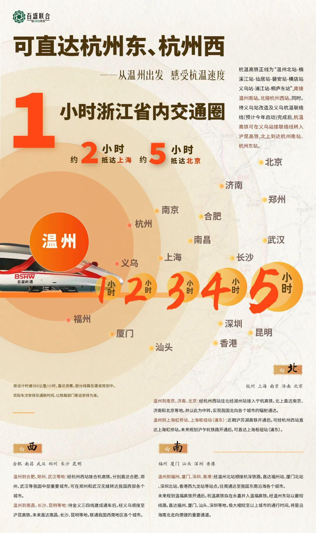 由百盛聯(lián)合集團(tuán)投資建設(shè)的杭溫高鐵即將正式通車。作為國務(wù)院混合所有制改革試點(diǎn)和國家發(fā)改委社會資本投資示范項(xiàng)目,杭溫高鐵是國家“八橫八縱”鐵路網(wǎng)重要組成部分,是浙江省實(shí)現(xiàn)“省域1小時交通圈”的關(guān)鍵工程。其正線為“溫州北站-楠溪江站-仙居站-磐安站-橫店站-義烏站-浦江站-桐廬東站”,北接杭州西站,南接溫州南站,并可在義烏站轉(zhuǎn)入滬昆高鐵,直達(dá)杭州東站、杭州南站,使溫州至杭州的通行時間縮短至約1小時。
